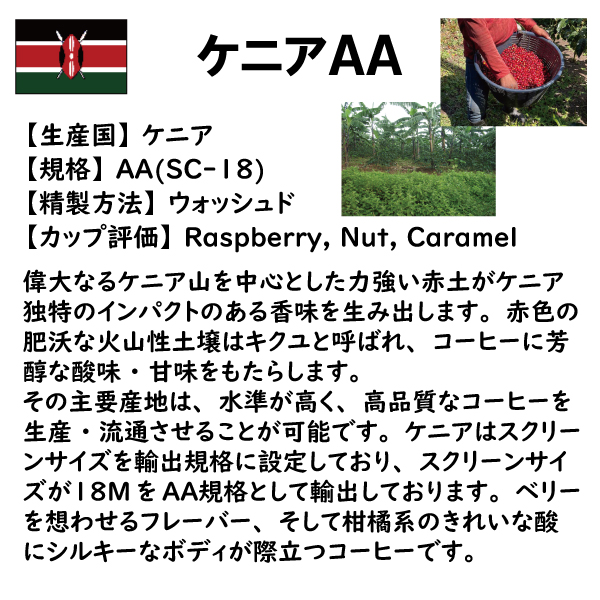 ケニアはコモディティです。ケニアのコーヒーは世界的評価も高く、伝統的なブルボン種栽培がおこなわれています。精選もケニア式と言われるウォッシュドを採用し、しかりした味わいが特徴です。ケニアでは昨今様々な品種改良や新たな精選方法への取り組みが行われています。