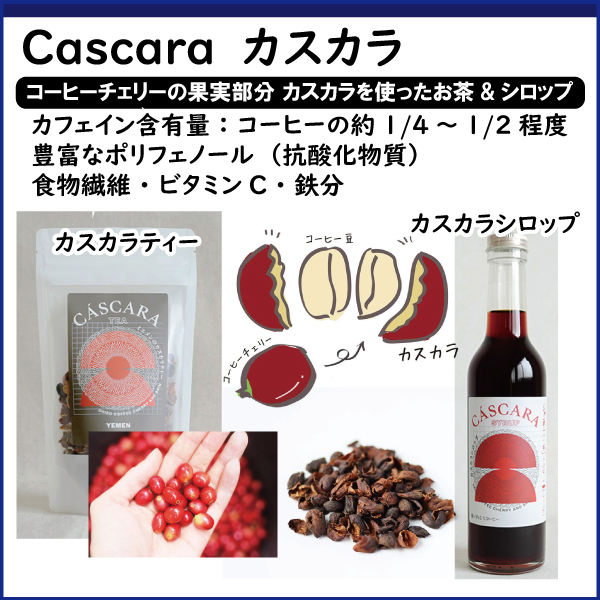 「カスカラティー」、「カスカラシロップ」のご紹介です。「カスカラ」とは聞き慣れませんね。「カスカラ(Cascara)」です。コーヒーを作る時に豆を取り出した後の実の部分は大概捨ててしまうのですが、それを乾燥させてお茶にしたものを「カスカラティー」、そのシロップが「カスカラシロップ」です。香りはどちらもエキゾティックな甘い香りで、嗅いでいるとドキドキして来るような魅惑的な香りです。エキゾティッーク。カスカラティーのお味は、甘い香りの、少し渋みの利いたハーブティーという印象です。カスカラシロップは、ホットケーキやヨーグルトにかけたり、牛乳や炭酸、お酒で割ったりすると良いかもしれません。シロップの甘味はてんさい糖、それにレモン汁で添加物は一切使用されていません。
