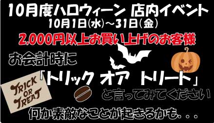 10月度2,000円以上お買い上げのお客様に会計時”トリック オア トリート”のコールをしていただくと、”何かすてきなことが起きるかも…”とお知らせさせて頂きました。是非、無理して2,000円以上お買い上げください。大の大人の皆様におっしゃって頂くのは恐縮ですが…