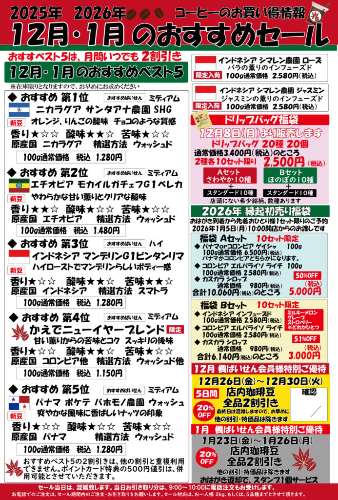 今月のおすすめベスト5は、12月-1月の2ヶ月分ですので、在庫を少し多めに用意しましたが、12月は最大の需要期ですので、無くなってしまう商品が出るかもしません。「これは」と思ったら、お急ぎください。