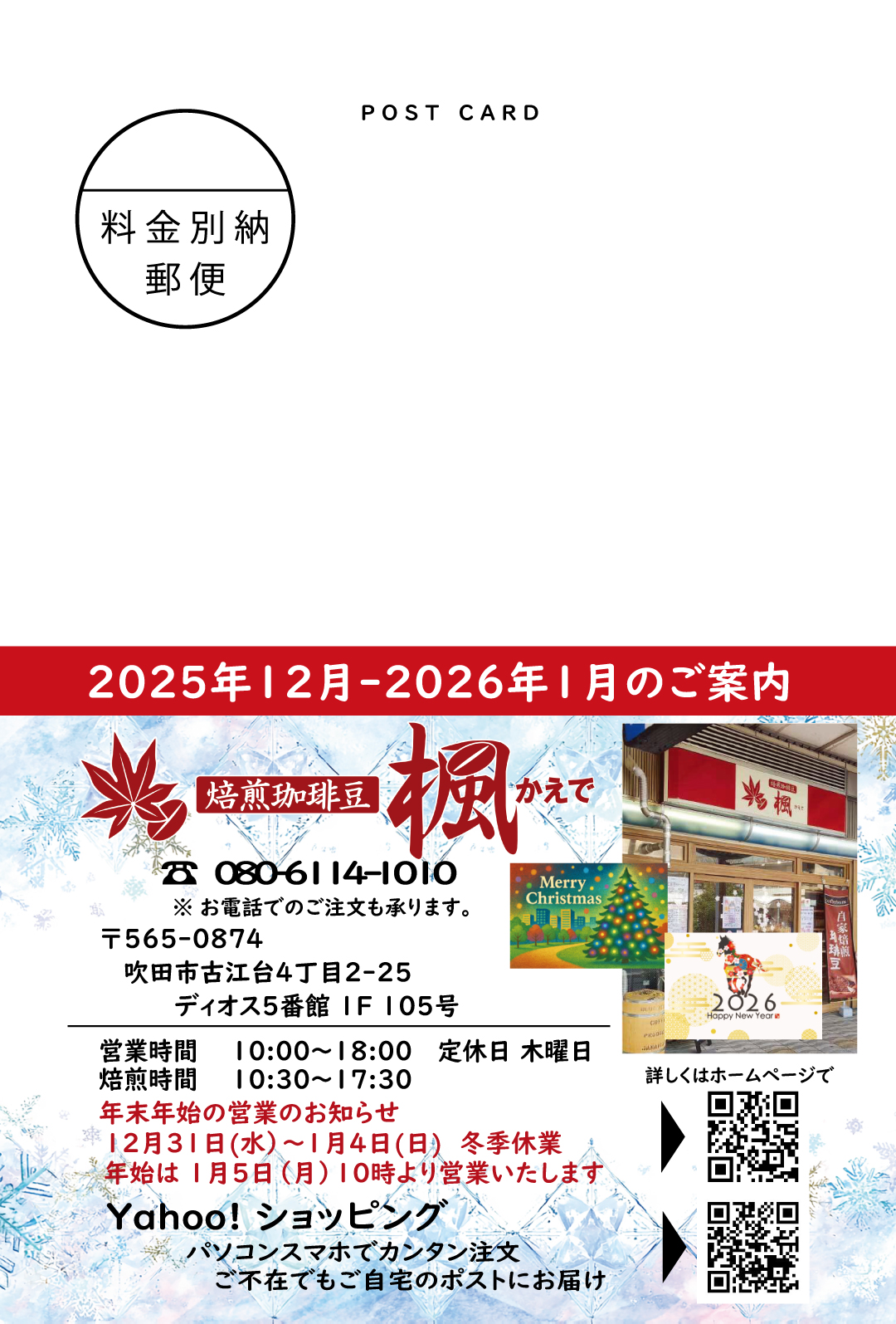 12月のおはがきを掲載します。11月はおはがきを出しませんでした。今後はネットでご覧いただけるようホームページにアップしていきたいと思います。