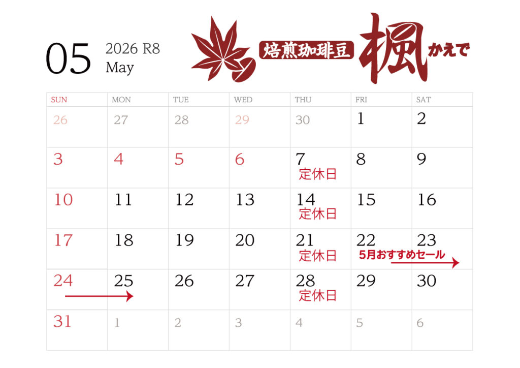 だんだん陽気が良くなってきてアイスコーヒーの販売比率が増えて来て、やがてホット派が少数派になるのですが、今年は少し早くアイス派が来ているような気がします。5月の予定を掲載します。さあゴールデンウィークまであと少し。美味しいコーヒーを飲んで、がんばりましょう。