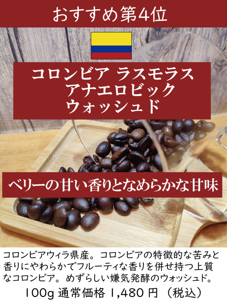 ひとつめは、コロンビア ウィラ ラス モラス アナエロビックウォッシュ エクセルソ EPで、長いので、ラスモラスと呼んでいます。ウィラというのはコロンビア北部のアンデス山脈の高地の地名で、コロンビアでは有数のコーヒーの産地です。以前のブログでもアナエロビックという精選方法についてお伝えしましたが、そこに洗浄を加えたプロセスなのだそうです。飲んだ印象は、フルーティーな香りは強過ぎず、しっかりしたコクがあって深い味わいで、どなたにも楽しんで頂ける仕上がりと思います。豆も高品質で欠点豆は少なく、ナチュラル風味でクリアな味わいというのは、まあまあめずらしい存在と思います。