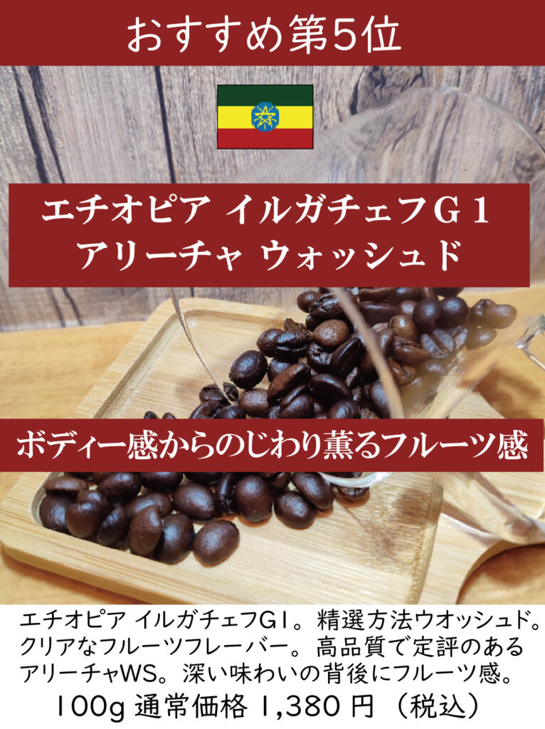 もう一つはエチオピアのアリーチャウォッシュドです。エチオピア産とイエメン産は「モカ」と呼んで良いのだそうです。エチオピアは多く輸入されており、定番として広く扱われています。中でもイルガチェフ(イルガチャフィー)という地区が、特に高品質で有名です。その中にいくつかウォッシングステーションと呼ばれる集荷場があって、その中のアリーチャというウォッシングステーションの商品です。エチオピアは、ナチュラル精選が多いのですが、最近はウォッシュドも出回っており、ナチュラル精選のフルーティな香りは好き嫌いが分かれるところですが、控えめな上品な香りとクリアな味わいが絶妙です。